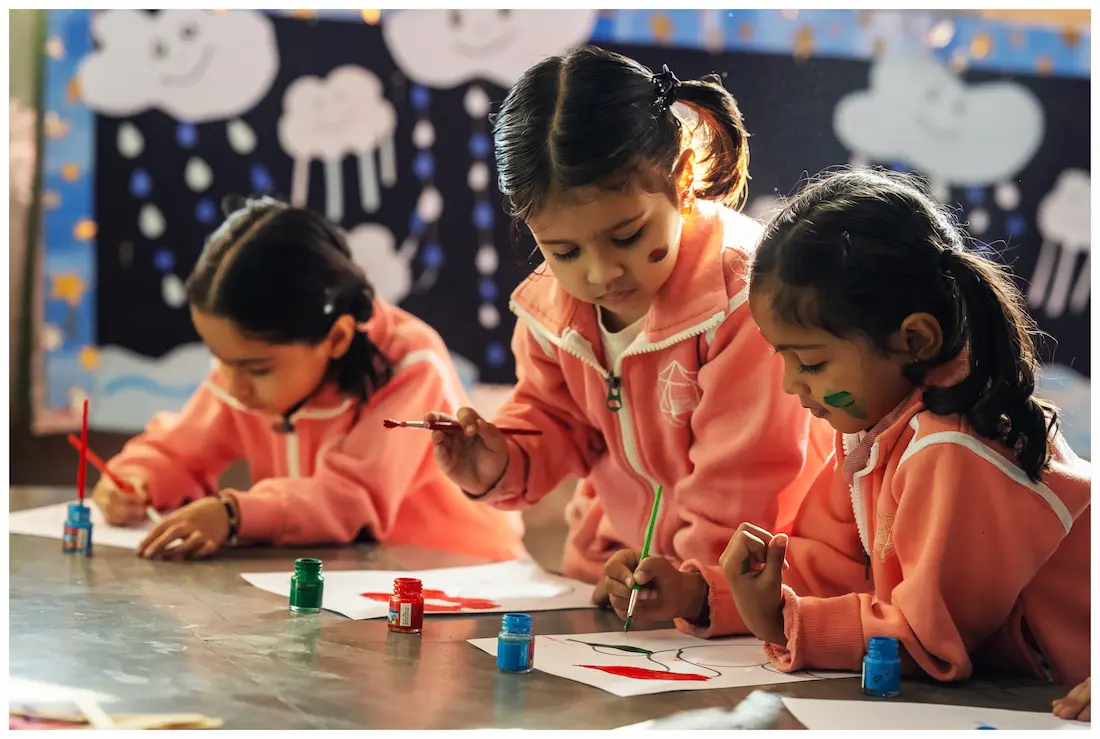 Paper-cutting, folding, pasting, paper mosaic, thread painting, vegetable printing, spray painting and a variety of other activities including painting on diyas for Diwali are some of the hand-work items taught to children.